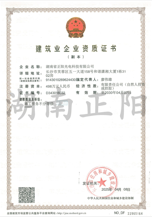 2025年4月8日,經(jīng)長(zhǎng)沙市住房和城鄉(xiāng)建設(shè)局審核批準(zhǔn),湖南省正陽(yáng)光電科技有限公司成功獲得“施工勞務(wù)”資...